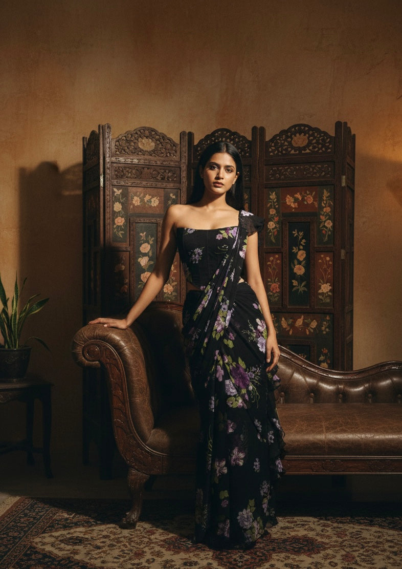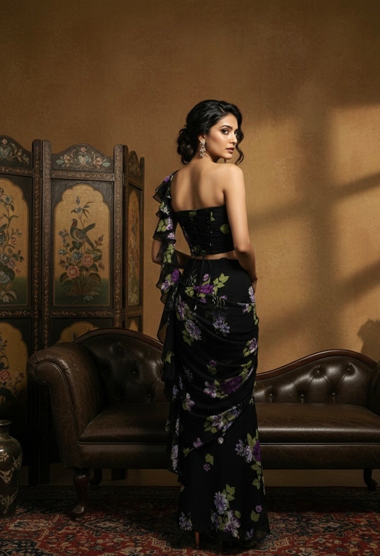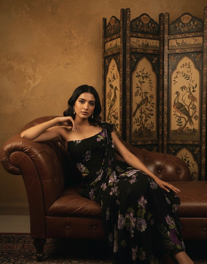 A modern draped silhouette in deep noir, elevated with delicate floral detailing and a sculpted bodice. Designed for effortless sophistication and quiet drama