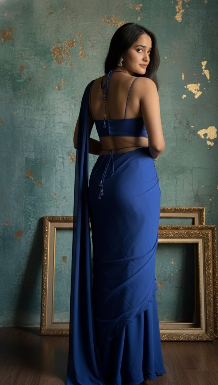 Featuring Hand embellishments with delicate crystal and beads Butterfly style Blouse. Paired with pre draped saree